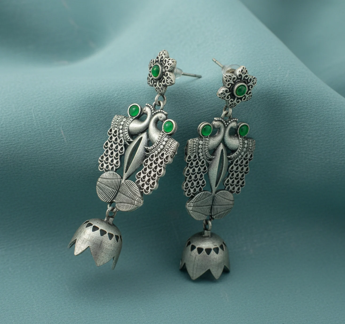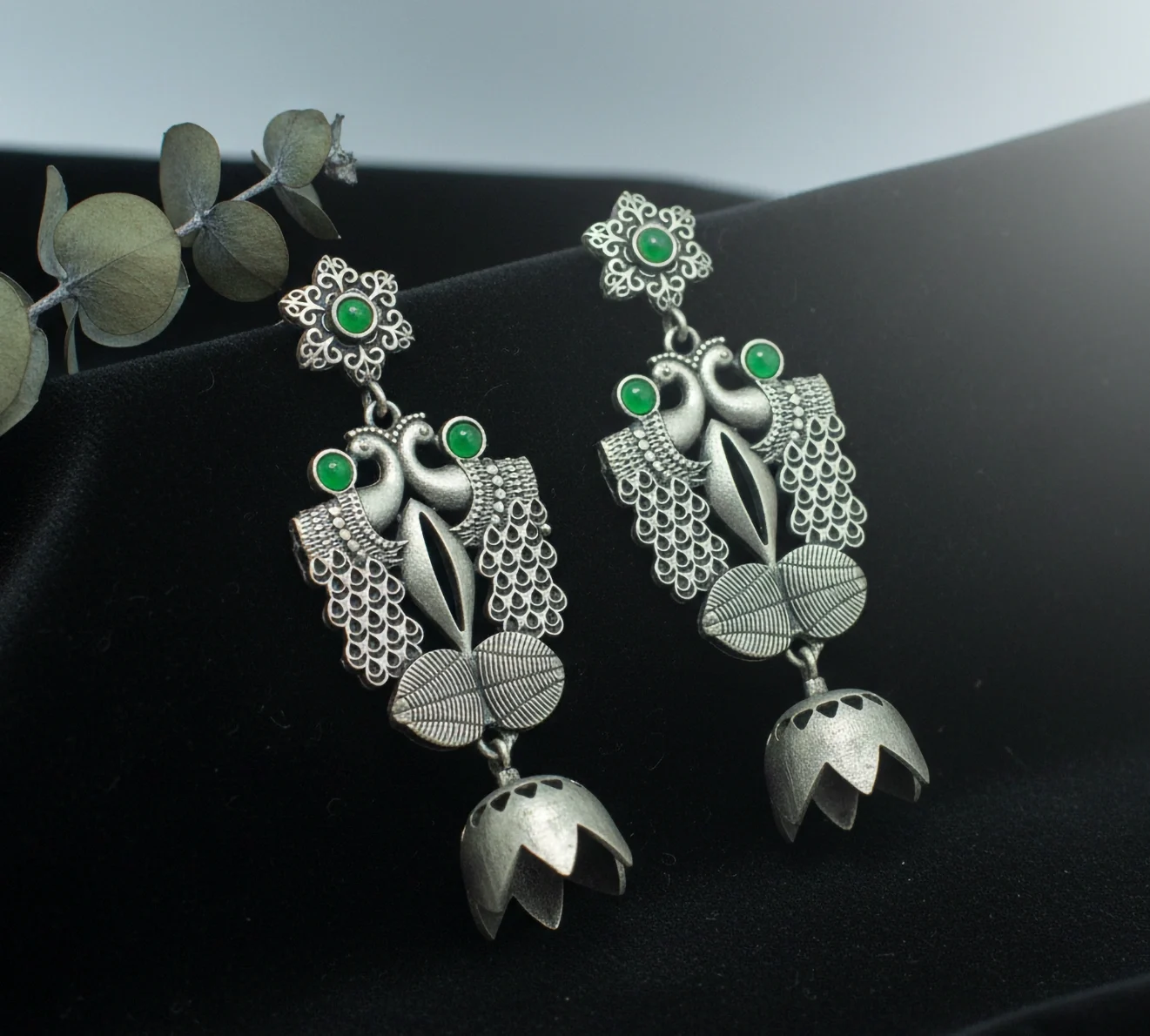 Oxidised Peacock Temple Drop Earrings with Green Stone.