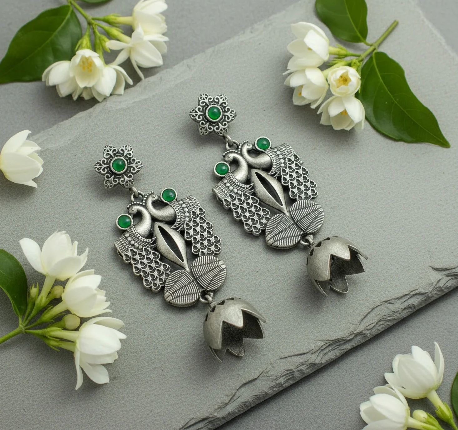 Enhance your ethnic look with these Oxidised Peacock Temple Drop Earrings, designed with intricate detailing and a traditional South Indian aesthetic. The earrings showcase a beautifully sculpted peacock motif highlighted with premium green stones, adding a graceful pop of colour to the antique silver finish.