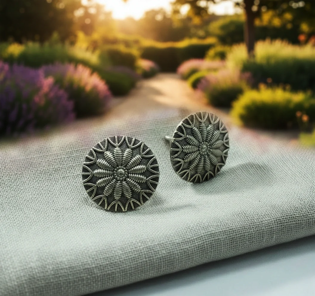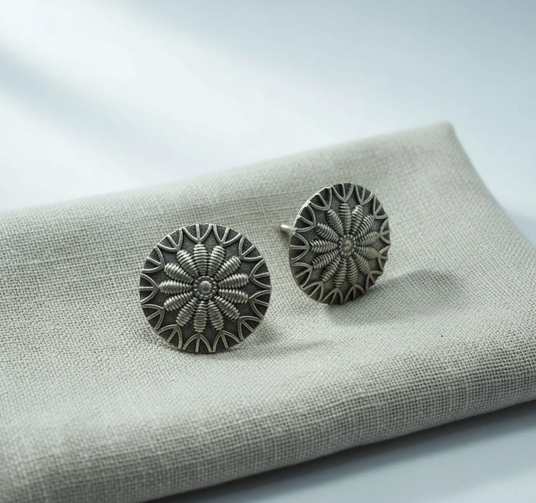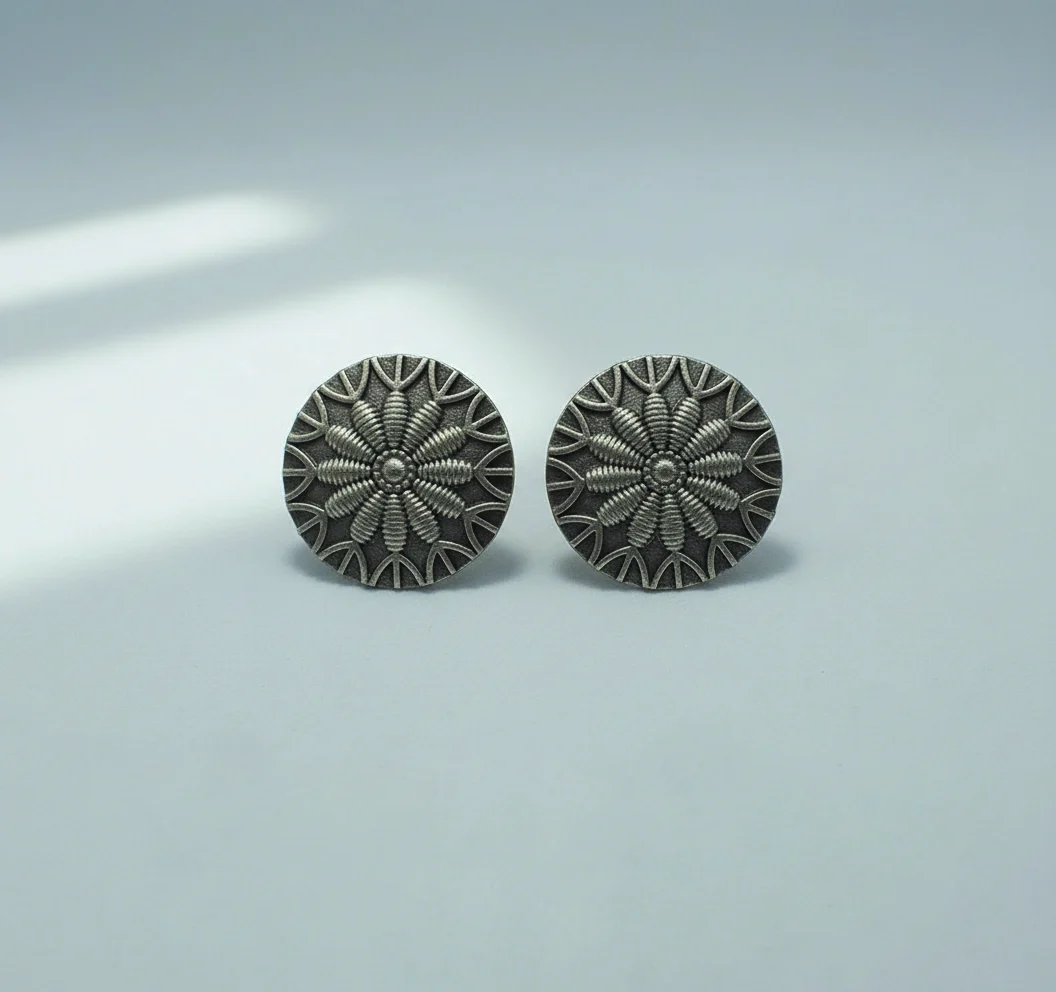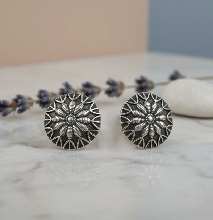 Classic oxidised round stud earrings featuring an intricate floral pattern. Lightweight, durable, and perfect for everyday ethnic or casual wear.